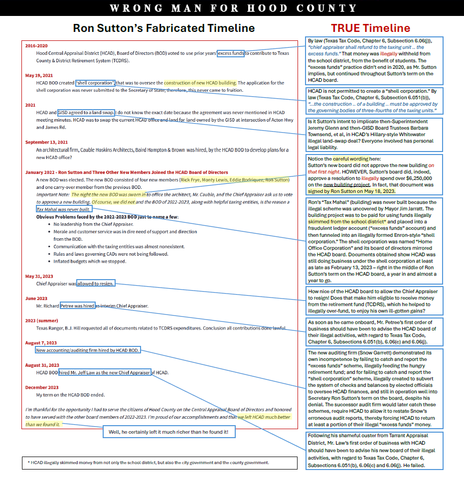 LET'S LOOK AT THE REAL TIME LINE FOR THE ACTIONS TAKEN BY MR. RON SUTTON AS SECRETARY OF THE HOOD CENTRAL APPRAISAL DISTRICT JAN 2022 THROUGH DEC 2023.