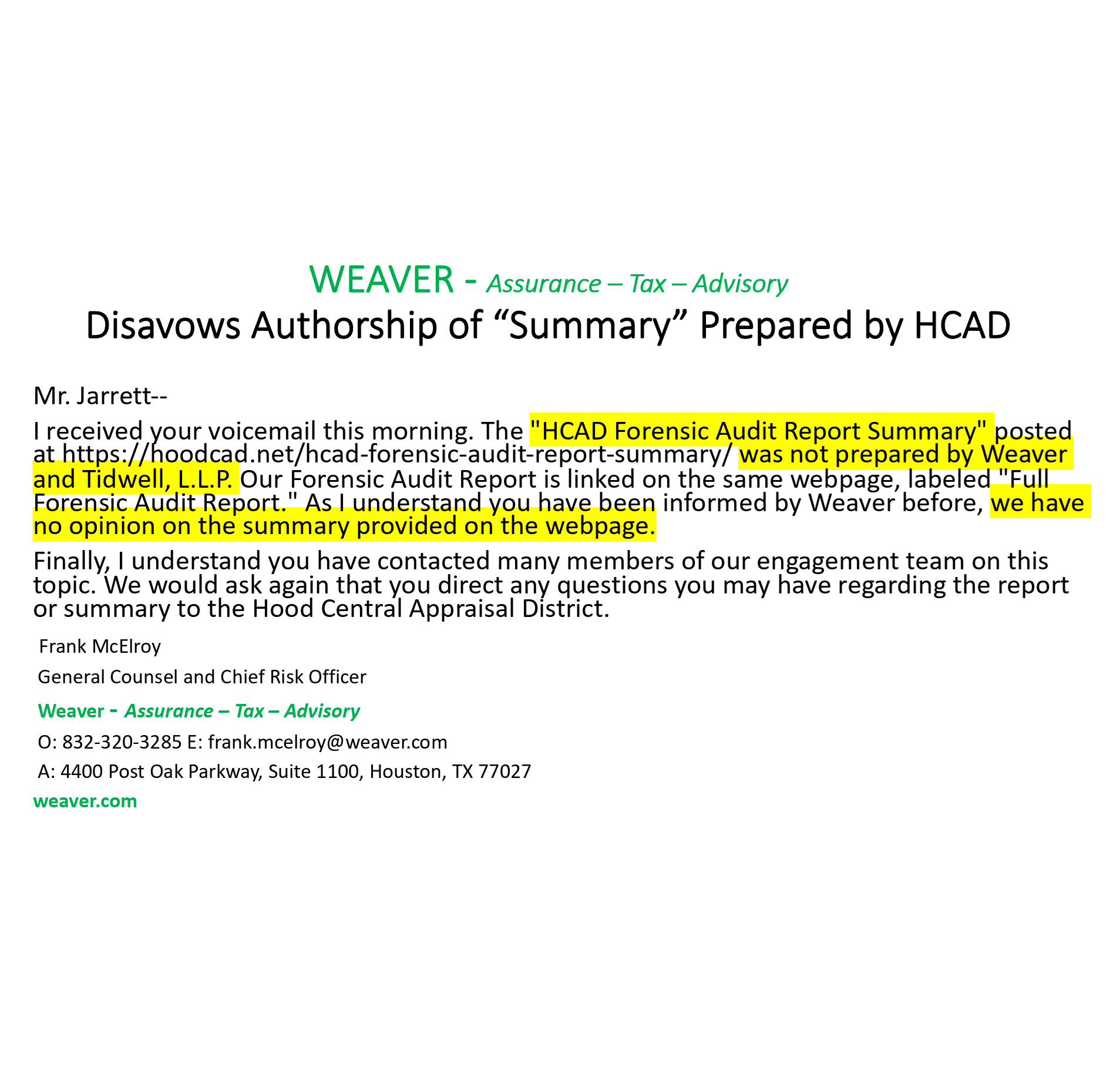 Even after the presentation to the City, County and GISD, which resulted in no approval, but a loud chorus of "NO's" from the Taxing Entities, the HCAD Board and Chief Appraiser pushed forward; with an Email from